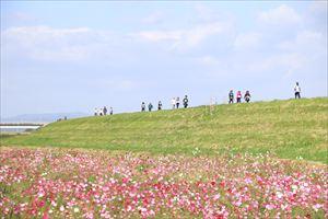 2025年9月18日菊池川の河川敷で色鮮やかに揺れるコスモスを眺めながらリフレッシュウォーキングを楽しみませんか?
