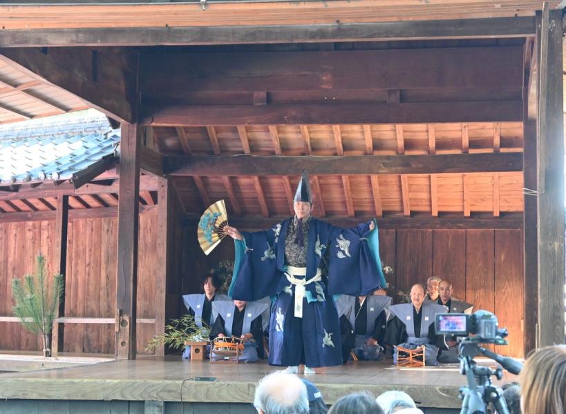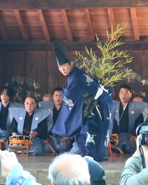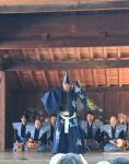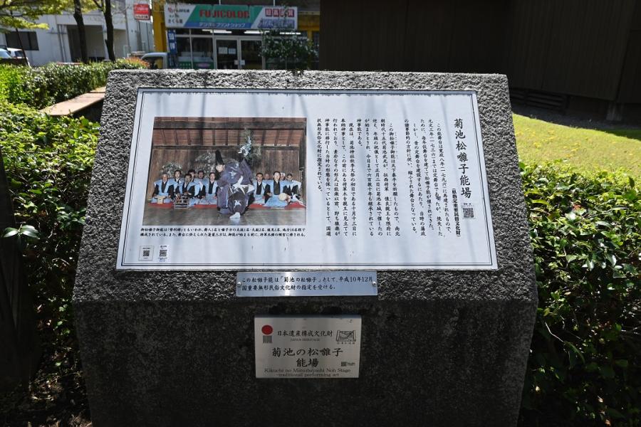 菊池の松囃子は、古くから菊池市において伝承されている芸能の一つであり、毎年10月13日菊池神社秋の大祭に、菊池高校前に建つ菊池松囃子能場(県指定文化財)で演じられています。能場の前には「将軍木(しょうぐんぼく)」と呼ばれる椋の木があり、征西将軍である懐良(かねなが)親王が杖を突いたときに芽吹いたものであるともお手植えのものともいわれているこの木を親王に見立てて舞います。 その起源については定かではありませんが、現在伝承されている詞章(ししょう)などからみて、室町期から継承されているものと考えられています。宝暦7年(1757年)の「菊池松囃子起源書」によると、南北朝時代、菊池15代武光の時に征西将軍として下向した懐良親王のために、正月の祝言として守山城内で行われたのが始まりといわれています。当時は正月2日でしたが、後に武光出陣中により正月の松囃子ができずに帰還を待ち、7月15日に行ったのが恒例となったそうです。 松囃子は舞人1名、大鼓2名、太鼓1名の囃子方と不定数の地方(じかた)及び後見1名により演じられます。舞の振りが古風であり、謡(うたい)も素朴な要素をとどめ、能の変遷過程を知る上で大変貴重なものです。勢利婦(せりふ)中に「寒暑時をたがえず」と順調な天候の表現があり、農耕への期待がうかがえます。 国指定無形民俗重要文化財。 |