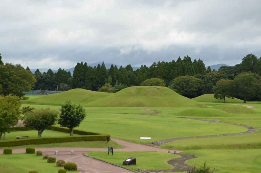 菊池川中流域の左岸、岩原台地(標高75m)の北縁近くに位置する県内でも有数の古墳群です。前方後円墳1基、円墳9基の計10基で構成されます。 その主墳となる岩原双子塚古墳は、墳長107mと県内でも最大級の前方後円墳です。埋葬施設は未調査のためわかっていませんが、古墳の形状から5世紀後半頃の首長墓と考えられます。この双子塚古墳の東から北にかけて、9基の古墳が配置されています。いずれも円墳で、東から、寒原1~3号墳、馬不向1~3号墳、塚原古墳、下原古墳、狐塚古墳といいます。 現在、「肥後古代の森鹿央地区」として整備されていますが、隣接する熊本県立装飾古墳館は、熊本県が全国一の数を誇る装飾古墳の専門館で、建築家安藤忠雄氏の設計により、前方後円墳の形をイメージして、平成4年に建てられました。県内の主要な装飾古墳の実寸大レプリカ12基を展示するのが特徴です。また、岩原古墳群の北側には、熊本市北区植木町より移築復元された横山古墳があります。装飾古墳で、双脚輪状文という全国的にも稀な文様が彩色で施されています。 古墳群に植栽された芝生が真緑に色づく5~8月にかけてが見頃です。また、熊本県内の装飾古墳一斉公開(春と秋の年2回)時に、古墳群北側の装飾古墳、横山古墳の公開を行っています。 古墳時代の巨大な前方後円墳や豪華な副葬品などは、その当時の菊池川の豊かな米により得られた経済力を今に伝えています。 |